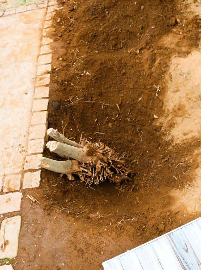 木の根は地上に見えている枝葉と同じ、あるいはそれ以上に広く深く張っています。直径10cm程度の細い木でも、手作業で掘り起こすのは至難の業です。無理に引っ張って腰を痛めたり、水道管やガス管を傷つけたりする恐れがあります。